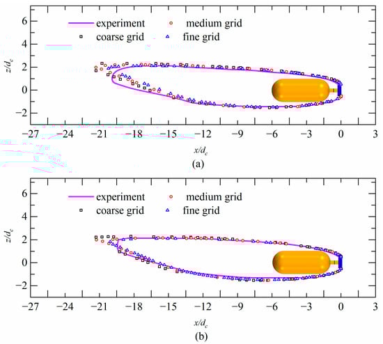Figure 8 compares the ventilated supercavity obtained from the experiments and numerical simulations. Figure 8a displays the fully submerged condition ( = 10.4, = 0.25, c = 0.08, h* = 16.7), while Figure 8b illustrates the shallowly submerged condition ( = 10.4, = 0.25, c = 0.08, h* = 5.7). The geometric dimensions of the ventilated cavity obtained from the three sets of grids have small errors when compared to the experimental results. However, there is a relatively large error at the cavity closure region due to the strong unsteadiness and gas leakage occurring at this position. As the geometric shapes of the free surface and cavity obtained from the three sets of grids are almost identical, a medium mesh is selected as the final mesh to balance computational cost and accuracy.