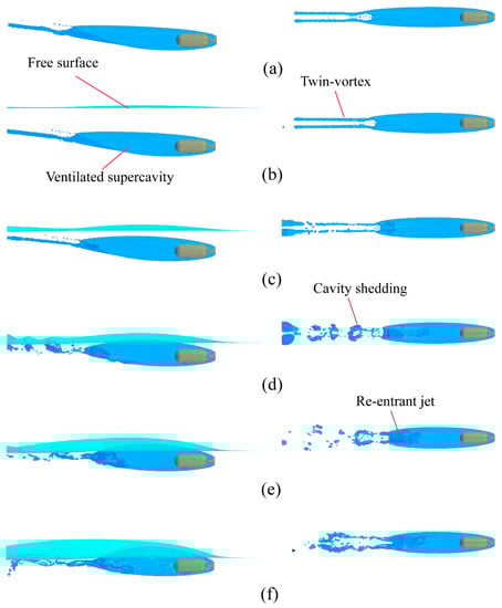 To gain a deeper understanding of the gas leakage mechanism, velocity vectors were drawn and are presented in Figure 16. The velocity disparity leads to the creation of two counterrotating trailing vortices at the ventilated supercavity tail, and both rotating trailing vortices form an upward velocity at the ventilated supercavity centerline, creating the two hollow tubes under the continuous action of two counterrotating trailing vortices [29], as shown in Figure 16a,b. The free surface influences the development of the re-entrant jet at the ventilated supercavity closure region. The twin-vortex tube ruptures into a bubbly flow that sheds and moves downward under the influence of the re-entrant jet, as shown in Figure 16d,e.
