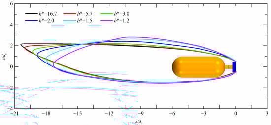 Figure 9 show the free surface shapes and ventilated supercavity shapes at different immersion depth conditions (h* = 16.7, 5.7, 3.0, 2.0, 1.5, and 1.2), where the blue isosurface (αv = 0.1) represents the ventilated supercavity obtained from numerical simulations, while the cyan isosurface (αg = 0.5) represents the free surface. Additionally, Figure 10 show the shape of the ventilated supercavity at the mid-longitudinal plane for various immersion depth conditions. It is observed that when the immersion depth is large, the ventilated supercavity is significantly influenced by gravity and exhibits obvious asymmetry, with the ventilated supercavity shifted upwards relative to the model’s symmetry line. A reduction in immersion depth results in a more pronounced effect of the free surface on the ventilated supercavity. This weakens the gravity influence and causes the tail of the supercavity to shift downwards when compared to conditions at greater immersion depths. Additionally, the gas leakage mode at the ventilated supercavity closure region has changed. Under high immersion conditions (h* = 16.7, h* = 5.7, and h* = 3.0), the air inside the ventilated supercavity leaks through two hollow tubes at the tail, exhibiting a typical twin-vortex tube, as shown in Figure 9a–c. Under low-immersion conditions (h* = 2.0, h* = 1.5, and h* = 1.2), the twin-vortex tube was shed under the action of the re-entrant jet, as shown in Figure 9d–f.