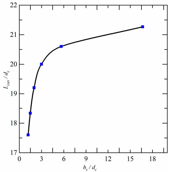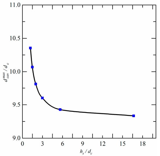 Figure 11 presents the relationship between the cavity length and immersion depth, with the vertical axis representing the dimensionless length of the ventilated supercavity based on the cavitator diameter and the horizontal axis representing the dimensionless immersion depth based on the cavitator diameter. Meanwhile, Figure 12 shows the relationship between the maximum diameter of the ventilated supercavity and immersion depth, with the vertical axis representing the dimensionless maximum diameter based on the cavitator diameter and the horizontal axis representing the dimensionless immersion depth based on the cavitator diameter. It is observed that as the immersion depth decreases, the ventilated supercavity length decreases, and the maximum diameter increases. The primary reason for this trend is that the distance between the free surface and the upper surface of the ventilated supercavity decreases, the vertical velocity between the two becomes shorter and the pressure difference between the two leads to higher acceleration of the fluid pointing towards the ventilated supercavity, which increases the cavity curvature and shortens the cavity length [34]. The specific mechanism of the interaction between the free surface and the ventilated supercavity is explained in Section 4.4.