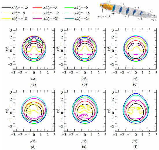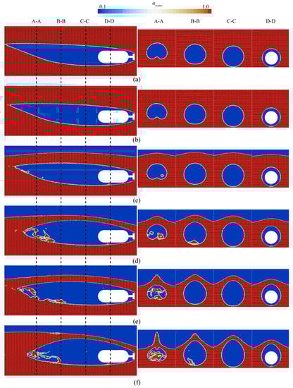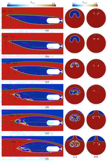 Figure 13 presents the ventilated supercavity shape at different cross sections for various immersion depth conditions (h* = 16.7, 5.7, 3.0, 2.0, 1.5, and 1.2). At high immersion depths, the ventilated supercavity curves upward along the center line of the model, and the ventilated supercavity’s cross section is deformed at the tail, forming a “crescent” region with a high void fraction. Additionally, two hollow tubes are formed in the far flow field of the ventilated supercavity through which air is leaked, as shown in Figure 13a,b. Ventilated cavity buoyancy is related to the gravity effect. At shallow immersion depths, the flow pattern inside the ventilated supercavity is more complex, with gas and water chaotically distributed. Additionally, the gas–water distribution in the circumferential direction exhibits high asymmetry, primarily attributed to the impact of the re-entrant jet [25], as shown in Figure 13c,d.
