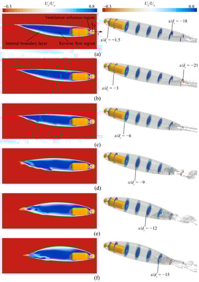 Figure 14 depicts the velocity distribution of the ventilated supercavity with different immersion depth conditions, with the left side showing the middle longitudinal section and the right side showing the cross section at various locations. The internal flow field of the ventilated cavity is classified into three regions: the internal boundary layer, the ventilation influence region, and the reverse flow region. The ventilation influence region is primarily located at the back of the cavitator, where ventilation jets are ejected from the ventilation holes. The boundary layer region is located near the ventilated supercavity surface and is parallel to the mainstream. The reverse flow region is located at the ventilated supercavity center and is opposite in direction to the mainstream. Under high-immersion conditions (h* = 16.7, h* = 5.7, and h* = 3.0), the reverse flow region at the ventilated supercavity tail presents a typical crescent shape and forms two hollow tubes with the same direction as the mainstream moving downstream. This indicates that the ventilated supercavity mainly drains downstream through two hollow tubes, as shown in Figure 14a–c. On the other hand, for shallow immersion conditions (h* = 2.0, h* = 1.5, and h* = 1.2), the flow characteristics in the wake of the ventilated supercavity are more intricate, consisting of forward and reverse-flow patterns within the reverse flow region, predominantly influenced by the presence of the free surface. The shape of the reverse flow region is irregular as a result of the re-entrant jet, as presented in Figure 14d–f.