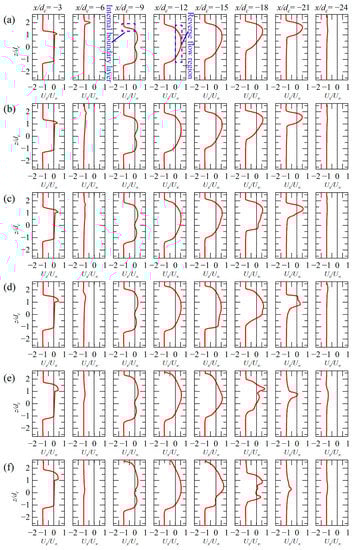 The velocity profiles for various positions (i.e., x/dc = −3, −6, −9, −12, −15, −18, −21, and −24). (a) h* = 16.7, (b) h* = 5.7, (c) h* = 3.0, (d) h* = 2.0, (e) h* = 1.5, (f) h* = 1.2.