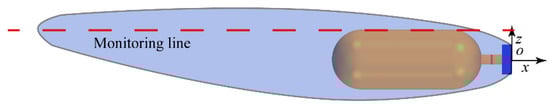 To gain further insight into the generation of the re-entrant jet, an analysis of the pressure gradient in the ventilated supercavity was conducted. The position of the monitoring line and the distribution of the pressure gradient on the monitoring line are displayed in Figure 17 and Figure 18, respectively. The monitoring line is situated in the mid-longitudinal plane immediately above the model’s upper surface, as depicted in Figure 17. A significant peak in the pressure gradient was observed at the ventilated supercavity closure region, indicating the presence of a strong adverse pressure gradient in the gas–water interface near the ventilated supercavity closure [25,46]. The adverse pressure gradient resulting from low pressure inside the ventilated supercavity and high pressure at the ventilated supercavity closure causes flow separation, causing water penetration into the interior of the cavity through the air–water interface as a re-entrant jet. As the immersion depth decreases, the pressure gradient peak at the cavity closure region becomes more pronounced, leading to a greater likelihood of the re-entrant jet breaking through the air–water interface. Ultimately, the twin-vortex tube at the cavity closure ruptures into a bubbly flow and periodically sheds under the continuous influence of the re-entrant jet.