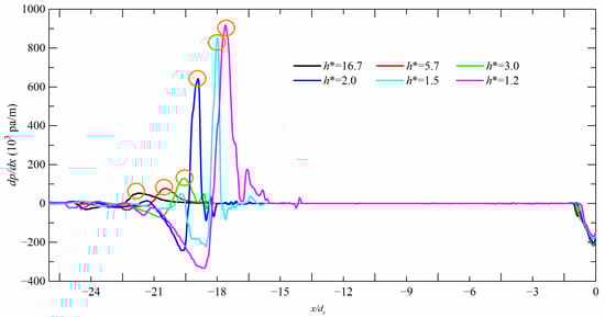 Variation in pressure gradient in the flow direction for different immersion depths.