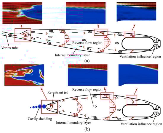 Figure 19 presents the flow structure and gas leakage mode under the effect of the free surface. Specifically, Figure 19a depicts a schematic diagram of the high-immersion condition, and Figure 19b displays the schematic diagram of the shallow-immersion condition. The ventilation influence region is primarily located at the back of the cavitator, where ventilation jets are ejected from the ventilation holes. There is a reverse region and an internal boundary layer downstream of the ventilated cavity. For the internal boundary layer region, the gas velocity increases from zero to the same velocity as the water flow in the same direction. For the reverse flow region, two zero-velocity bands can be observed near the model. One zero velocity band separates the internal boundary layer and the reverse flow region, while the other zero-velocity band is present at the model’s surface. A more significant reverse region exists behind the tail of the model. At high immersion depths, two hollow tubes form at the cavity end, and air leaks through these tubes, resulting in a typical twin-vortex tube leakage mode. On the other hand, for shallow immersion depths, the twin-vortex tube at the cavity closure ruptures into a bubbly flow and periodically sheds under the continuous influence of the re-entrant jet.