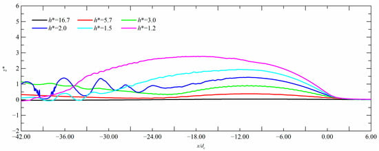 Shapes of the free surface at different immersion depths. (a) h* = 16.7, (b) h* = 5.7, (c) h* = 3.0, (d) h* = 2.0, (e) h* = 1.5, (f) h* = 1.2.