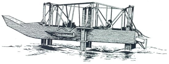 Propulsive characteristics of the oscillating wing in unbounded fluid have been investigated in the works of Theodorsen [15], Nekrasov [16], Sedov [17], and Gorelov [18]. Rozhdestvensky and Ryzhov [19] provided one of the first reviews of research and development of flapping wing propulsors and some representative vehicles equipped with them. In particular, they analyzed natural bionic propulsors of insects, flying warm-blooded vertebrates, and also touching upon fish and cetaceans. The authors of [19] discussed an engineering classification of propulsive systems with flapping wing elements and some 2D and 3D mathematical models thereof comprising effects of the flow boundaries, unsteadiness, and optimal modes of operation. Examples of vehicles making use of flapping wings included: a cutter on underwater flapping wings developed at Central Aerohydrodynamic Institute named after Zhukovsky, see Grebeshov and Sagoyan [20]; a human-powered submarine “Afalina” of Saint Petersburg State Marine Technical University (1992); a 200-ton Russian fishing vessel with a spring-loaded bow wing, see Nikolaev, Savitskiy, and Senkin [21]; and MIT laboratory robot “Robotuna”, see Barrett, Grosenbaugh, and Triantafyllou [22]. In association with the subject of the present paper, it is worthwhile to mark a unique feature of the TSAGI cutter, which used hydrofoils providing both propulsion and lift, see Figure 2 borrowed from [19]. These ideas have been further implemented by designers of pumped hydrofoil and O-foil [23].