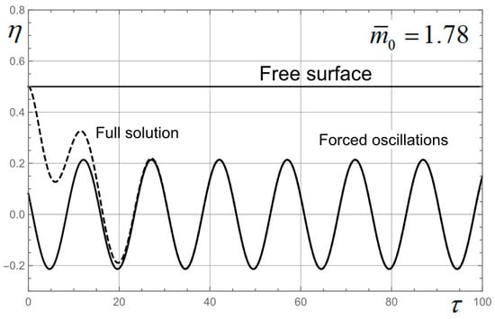 The value of Strouhal number for which the thrust and drag are equal is designated as and corresponds to the cruising mode. Calculated oscillations of the PH for the same values of and are illustrated in Figure 10 and Figure 11.