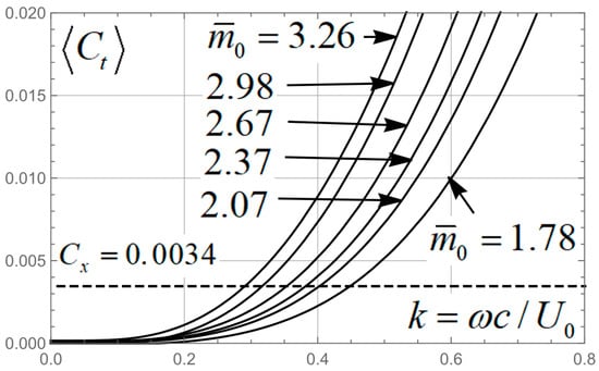 where the derivatives do not depend on time and are given by Formula (35). It should be kept in mind that in Theodorsen calculations, the Strouhal number is defined through half chord length , whereas in the present paper, this similarity criterion is based on the whole chord length Thus, in the calculations, we should insert