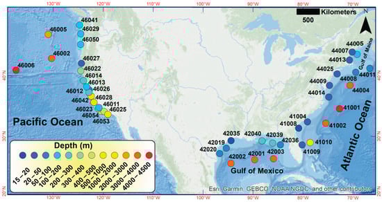 The raw data we considered in this study are SWH measurements obtained from the NDBC buoys. We only consider buoys that have at least 20 years of SWH records between 1990 and 2020, given that wave climate studies need a long-term record of data. Based on this criterion, Figure 1 shows the selected 43 buoys off the U.S. Pacific, Atlantic, and Gulf of Mexico Coasts. Most buoys are located on continental shelves. The shallowest buoy station, buoy 42035, is located at a water depth of 16.2 m in the Gulf of Mexico. The water depth is deepest (4486 m) at the location of buoy 41001 in the Atlantic Ocean.