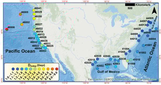 Many approaches have been proposed to choose , which resulted in a wide range of values from 1.25 to 20 days for different ocean basins []. The approach proposed by [,] was based on the analysis of atmospheric patterns to obtain the length of storms. Their results present the spatial variation in the length of the storms, with a Northeast Pacific duration of 11 days. Another approach, which is adopted in the present study, accounts for a geographic- and climate-dependent through an autocorrelation function (ACF). In this approach, should be longer than the time interval between the local maxima in the time series. This can be achieved by choosing to be longer than the time lag corresponding to an ACF of between 0.3 and 0.5 []. The ACF, rk, can be estimated as per [].