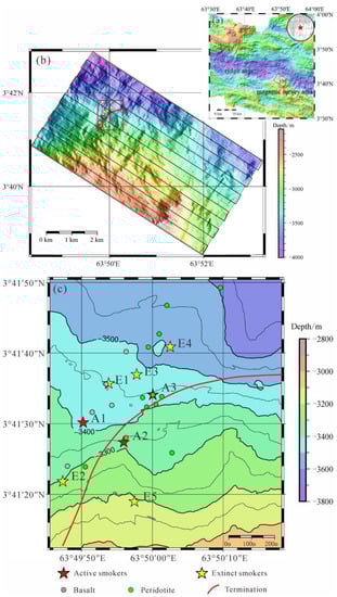 The slow-spreading Carlsberg Ridge is located in the Northwest Indian Ocean within 2° S–10° N, with a total length of about 1500 km and a full spreading rate of 22–32 mm/a [23,24]. The Tianxiu Vent Field (63°50′ E, 3°41′ N) is a typical off-axis vent system, and lies on the south slope of the asymmetric expansion segment of Carlsberg Ridge, with an off-axis of about 5 km at a water depth of 3000–3600 m (Figure 1a,b). Various rock types were collected in hydrothermal sites and the surrounding region, including basalt, peridotite, and gabbro [25]. A total of 8 hydrothermal black smoker clusters were observed in the study area, which are all developed within 300 m of the termination of a detachment fault. Among them, 3 clusters (A1, A2, and A3) were active and emitting hydrothermal fluid, and 5 clusters (E1, E2, E3, E4, and E5) were extinct (Figure 1b,c) [26].