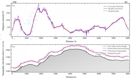To eliminate the high-frequency short-wavelength noise of the magnetic anomaly caused by inconsistent terrain clearance, the data were filtered using a Butterworth low-pass filter to eliminate the high mutational sites. Next, the magnetic anomaly was converted to the new observation height of a terrain constant altitude difference (100 m) after filtering using the COMPU-DRAPETM technique [29], realizing height correction. Subsequently, low-pass filtering of the magnetic anomaly was performed to smooth the data. Figure 2 shows the processing result of the representative profile L7. After all of the 12 profiles were processed, the resulting magnetic anomaly data were interpolated to form grid data with 90 m spacing.
