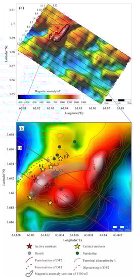The observation of thin sections of rock samples under a microscope shows that the peridotite samples have been subject to severe serpentinization, with abundant magnetite grains present in serpentine veins [25]. Therefore, it is considered that the high magnetic anomalies observed in the footwall of the detachment fault in the TVF are caused by the serpentinization of peridotite. The peridotite originally in the upper mantle is uplifted to the seafloor during the detaching process, and interacts with seawater to create strongly magnetized magnetite accumulated in the mineralized zones below the hydrothermal sites. Meanwhile, the high temperature environment of hydrothermal eruption will promote the increase in magnetite proportion in serpentinization products [31]. This is consistent with the positive magnetic anomaly of other ultramafic-associated hydrothermal systems [9,31,32]. However, in the northern part of the area near E4, serpentinized peridotite was sampled, but the positive magnetic anomaly was not very strong. Therefore, this region could belong to the hanging wall of the detachment fault, with the presence of peridotite talus originating from the footwall. This is consistent with the topography of the region, which is apron-like. According to the distribution of the magnetic anomaly and rock sampling information, it is determined that the termination of the detachment fault is a 120 m wide alteration belt extending from the southwest to the northeast in the area (Figure 3b). Among the three locations with extremely high magnetic anomalies, hydrothermal black smokers have been observed in the vicinity of both the southwestern and southern ones, while the northeastern region has not been explored yet. We infer that an ultramafic-hosted hydrothermal deposit is likely to exist in this region. This is to be confirmed by future investigations.