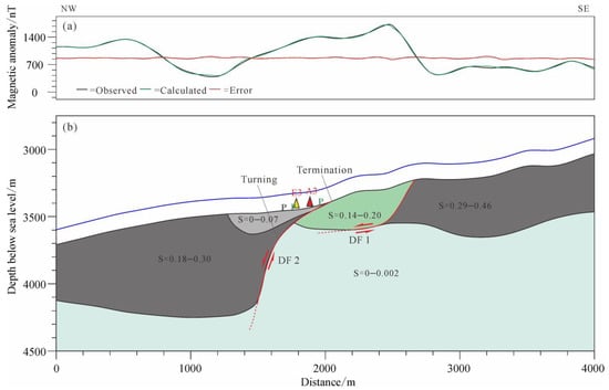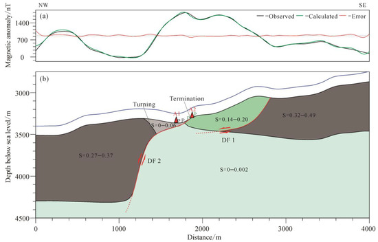 Based on the obtained results of forward modeling of a magnetic anomaly in the model, it can be argued that the detachment fault (DF2) slipped from 2800 m to 1850 m along the NW in the horizontal direction on the L7 profile, and the detaching distance is about 950 m. The superficial dip angle of the fault is ~15°, changing suddenly to 70° at a depth of 300 m. The fault has extended towards deep areas for more than 1000 m. On the L8 profile, the detachment fault (DF2) has slipped from 2660 m to 2050 m along the NW in the horizontal direction, with a detaching distance of about 600 m. The superficial dip angle is ~30°, changing to 70° at a depth of 220 m. The fault extended towards deep areas for more than 800 m. The now-deactivated fault (DF1) may be located on the magnetization boundary between the OCC and the basaltic host-rock in the footwall of the two profiles. This fault is hidden below the detachment surface of DF2, and the dip angle is very small (~8°). The location where the dip of DF2 turns in the L7 and L8 profile models is located 350 m northwest of the DF2′s termination in the planar projection, and the termination of DF1 is about 700 m southeast of the DF2′s termination in the planar projection (marked as a black dashed line and red dashed line in Figure 3b, respectively). They both roughly coincide with the magnetic anomaly gradient boundary, indicating that the magnetic distribution of the hydrothermal sites can reflect the subsurface morphology of the detachment fault. The range of high magnetic anomalies on the L7 profile is wider than that on the L8 profile, with two adjacent maximum points of magnetic anomalies. Additionally, the detaching range of the detachment fault is wider, the extension depth is deeper, and the alteration range of the footwall peridotite and basalt is wider, indicating that the fracture structure below L7 is more developed than that below L8.