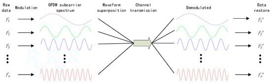 Each subcarrier sequence is sending its own signal, overlapping each other in the medium and finally seeing the signal at the receiver is f t . After receiving the hybrid signal f t , the receiver performs the operation of multiplication and integration on each subcarrier, respectively; then, the signals carried by each subcarrier can be taken out, respectively. The OFDM system in the time domain is shown in Figure 1.