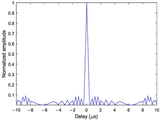 The autocorrelation function of the 32-bit P4 code is simulated and analyzed. As shown in Figure 3, the autocorrelation performance of 32-bit P4 code is relatively good, which can effectively reduce the adverse impact of communication information modulation on the ambiguity function of the integrated waveform. It is beneficial to the detection and communication integration of echo signal identification [29,30].