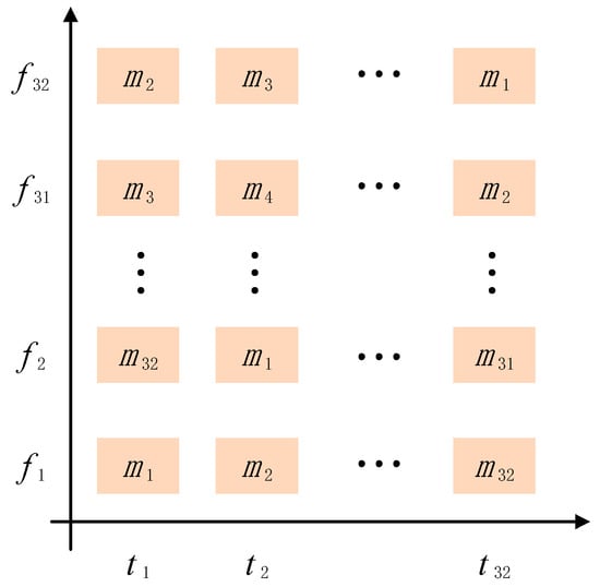 where M is the number of OFDM symbols, N is the number of subcarriers, T b is the width of an OFDM subcarrier symbol, f = 1 / T b is the subcarrier frequency interval, h m , n represents the communication data information loaded on the m th symbol of the n th subcarrier of OFDM, and it is an N × M matrix. In the matrix, each column vector represents an OFDM symbol, each row vector represents an OFDM subcarrier, and each element represents the complex data made from binary data by a cyclic shift of P4 code. The time-frequency structure of P4 code-modulated OFDM detection and communication integration signal is shown in Figure 6: