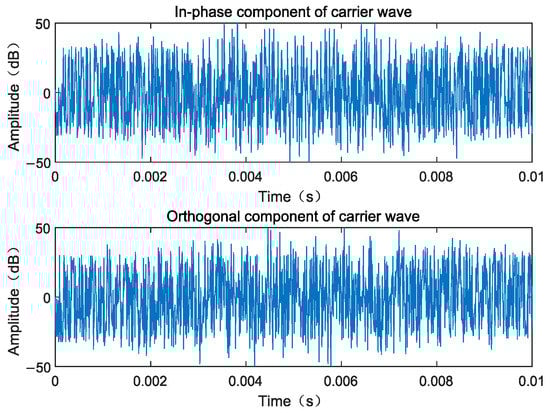 The binary data are generated at the transmitter, and the communication information data are encoded and modulated into the P4 code sequence. After modulation, data are converted into multi-channel low-speed data through series-to-parallel and then IFFT in the digital domain and converted into the serial data stream after parallel-to-serial conversion so as to obtain the carrier signal of IUDCS after OFDM multi-carrier modulation. The in-phase and orthogonal components are shown in Figure 8.