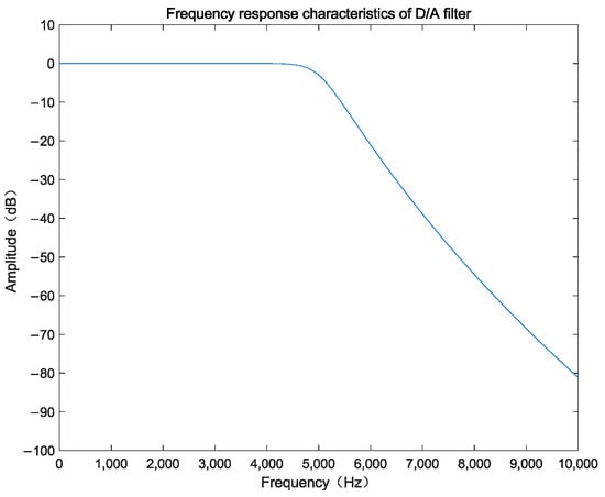 A filter with a normalized cut-off frequency of 1/10 and filter order of 13 is selected to filter the integrated signal of detection and communication after modulation. The output digital signal processed by the digital filter must undergo digital–analog conversion and smoothing processing. The frequency response characteristics of the D/A filter are shown in Figure 10.
