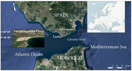 The study area is a coastal dune located in Valdevaqueros (Cadiz) on the southernmost point of Spain (Gibraltar Strait). The base data are meteorological data from Tarifa (Cádiz) and a 2012 field experiment carried out at the dune. The Valdevaqueros Dune (Cádiz) is approximately 10 km away from the meteorological station of Tarifa. The meteorological station of Tarifa is located on a promontory above the port basin and is managed by the Spanish Official Meteorology Agency (AEMET, www.aemet.es, accessed on 16 April 2023). The elevation (altitude) of the ground level at the Tarifa station is around 32.00 m above mean sea level (a.m.s.l.), which is used as a vertical datum for this research. Figure 1 illustrates the study site and shows the relative location of the meteorological station of Tarifa and the Valdevaqueros Dune.