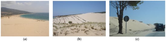 This dune is in one of the windiest points in Spain. The system is formed by accumulations of sand that migrate from the beach due to intense easterly winds. The result is a sand formation oriented to the NE-SW, as Figure 2a,b show. Its dynamic is causing a relevant impact from a scientific and social point of view []. Here, the frequent occurrence of easterly winds has generated a highly mobile dune []. High sand migration rates occur in the dune because 70% of the wind speed exceeds the threshold velocity for sediment. The climatic conditions are unique for this area [], mainly due to the presence of a long shoreline (more than 40 kilometers) and a cove before reaching the dune. This stretch of shoreline is only interrupted when the lagoon of the Valle River connects with the sea during the great floods []. The wind-blown sediment is a well-graded material composed mainly of quartz, with an average sand size of 0.3 mm [,].
