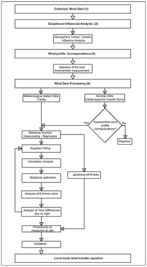 Thus, a methodology to achieve an equation that manages the relationship between meteorological station data and the measured winds in a local area should be developed, e.g., to determine the winds acting over a coastal dunar system. However, such a method could also be extrapolated to other systems under the same conditions, such as harbors, shorelines, other coastal dunes [], wind farm foundations [], and beach geomorphology [].