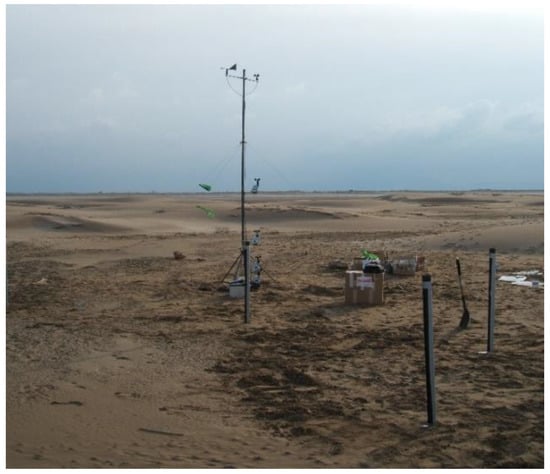The field experiment carried out in 2012 measured wind data using a mast with anemometers at different heights of 0.25, 0.50, 1.00, and 4.00 m. Figure 4 shows the anemometer after being assembled on the windward part of the coastal dune (shoreline).