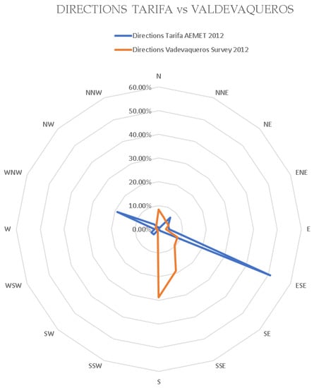 The data from the anemometers had to be processed and fitted with data from the meteorological station of Tarifa in order to align the correspondence between sampling frequencies. Figure 6 shows the different directions between the two measurements.