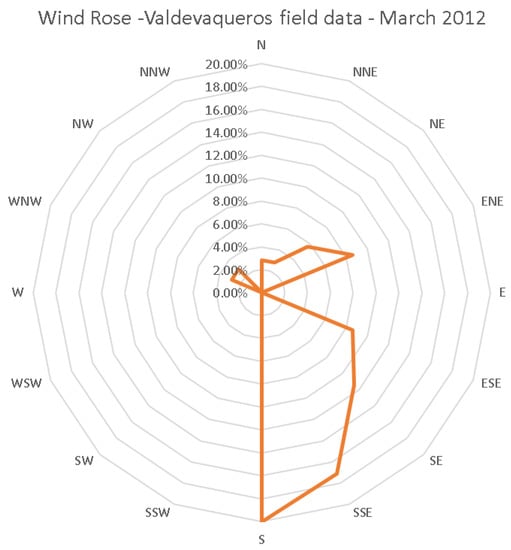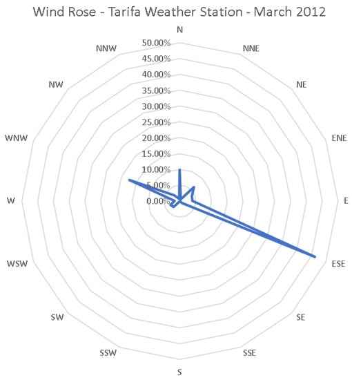 The prevailing direction at Tarifa is east–southeast, with a few variations turning around the north and west, which barely represent around 20% of the historical data. Figure 9 outlines the frequency of wind directions at Tarifa in March 2012.