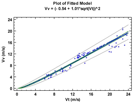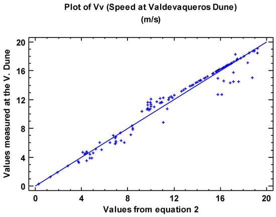 where Vv is the predictand for the velocity at the dune and Vt is the predictor (values measured at the meteorological station of Tarifa) with the coefficients in m/s. The ANOVA test yielded a value lower than 0.05 for fitting the coefficients a (−0.54) and b (1.01). The R-squared result indicated that the chosen model could explain 96.98% of the variability in speed. The correlation coefficient was 0.98, indicating a strong relationship between the variables. The standard error of estimations is 0.14, and the mean absolute error is 0.09. These results demonstrate that the methodology presented here can obtain a highly accurate mathematical expression. Figure 11 provides a graph illustrating the values resulting from Equation (2).