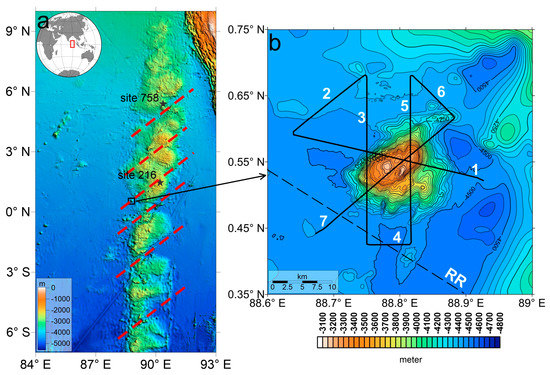 PARASOUND seismic data were recorded during all cruises in parallel with the bathymetric survey. The study area included seven profiles, four of which crossed the mountain. Unfortunately, due to technical and weather problems, the quality of the materials is not high. The data obtained, which were recorded onboard with an SEG-Y format, were processed using the RadExPro 2019.1 software. The workflow of the processing consisted of the following steps: frequency filtering, muting, static correction, equalization of the amplitudes, deconvolution, etc. IHS Kingdom Suite software version 8.8 was used for interpretation, visualization and construction of 3D images, as well as for time/depth conversion by section. The geological interpretation of sub-bottom profiles was carried out based on the criteria of seismic stratigraphy in order to identify the main seismic sequences [35,36,37]. We integrated available core data from the following sources for interpretation of sedimentology: core data from Ocean Drilling Program (ODP) Leg 121 Site 758 (05°23.04′ N, 90°21.66′ E) and International Ocean Discovery Program (IODP) Leg 353 Site 1443 (5°23.01′ N, 90°21.71′ E) [15,38]. These sites were drilled ~550 km north of the study area. In the nearest Site 216 Deep Sea Drilling Program (DSDP) (01°27.73′ N, 90°12.48′ E), no samples were taken from the upper part of the section [14]. The drill sites have similar depositional environments; therefore, we assumed that the sedimentology and physical properties did not vary significantly.