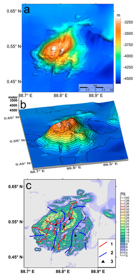 The seamount slopes differ significantly in their morphology. The western slope is weakly dissected and steep, with slope angles ranging from 20 to 30–34° (Figure 2c). The southwestern slope is somewhat flatter, with angles of 10–20°, and is dissected by spurs and depressions, as is the northwestern slope. At the foot of the latter, there is a broad protuberance of WSW-ENE trending, formed by separate short ridges. The southeastern slope of the seamount is characterized by a rather complex relief. In its upper part, the slope angles are 18–25°, and at a depth of 3500–3550 m, a stage of about 1.5 × 2 km is marked, with a conic hill in its center. At a depth of 3800–3900 m, a broad trough separates a step of about 6 km long, in the southern part of which there is also a conic hill more than 150 m high. The slope angles in the lower part of the slope do not exceed 10°, and only in some places on the step ledges does it reach up to 20°.