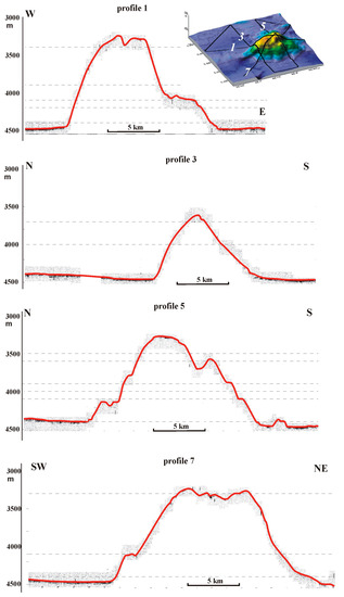 The morpho-structural analysis of the bathymetric data is obtained, and the bathymetric map of the seamount constructed based on them (Figure 1 and Figure 2) allows us to trace several clear morphological trends, apparently of a tectonic nature. The rectangular shapes of the seamount suggest that the formation of its modern morphology was also influenced by tectonic factors, namely the existing fault zones. The most well-defined are the trends of the SW-NE strike, which are evident in the topography of the seamount and the adjacent section of the NER. These are consistent with the strike-slip structures (Figure 1a) that define the specific echeloned morphology of the northern segment of the ridge [13,23]. The nature and timing of the formation of these SW-NE strike-slip faults in the NER, which possibly continue into the adjacent troughs, are still debatable and are not discussed in this paper. Another distinct morphological trend is the orthogonal SE-NW strike-slip faults, which can be traced in the relief of the basement of the seamount and deeper parts of the polygon. Slightly different trends of SSW-NNE strike are observed in the topography of the upper part of the seamount, with which the ridges on its vault are associated. The troughs separating them are traced into the slope limits and divide the seamount into two massifs (Figure 2). Similar troughs also separate the lower part of the southeastern foothill of the seamount with dissected relief. The features of the seamount’s relief are well illustrated by the seismic profiles crossing it (Figure 3).