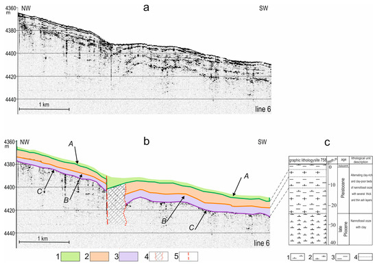 Seismic line 6 north to the seamount: (a) original uninterpreted and (b) interpreted. Reflectors A, B, and C are shown by green, orange, and violet lines. 1—seismo-stratigraphic unit 1; 2—seismo-stratigraphic unit 2; 3—seismo-stratigraphic unit 3; 4—disturbed zone with a chaotic acoustic structure and no of correlation of reflectors; and 5—fault. It was not possible to identify the seismo-stratigraphic unit below reflector C. The position of line 6 is shown in Figure 1a. (c)—lithostratigraphic summary of Site 758 ODP. 1—clayey nannofossil ooze; 2—nannofossil ooze; 3—clay; and 4—volcanic ash.