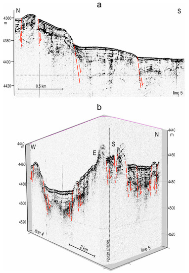 The PARASOUND profiles near the seamount slopes showing fault possible activity. (a) Profile 5 north to the seamount. (b) Profiles 4 and 5 south to the seamount. Possible faults (red dotted line) in the upper part of the sedimentary section, coming to the bottom surface. The red arrows show the direction of displacement along the fault. The position of the profiles is shown in Figure 1b and Figure 3.