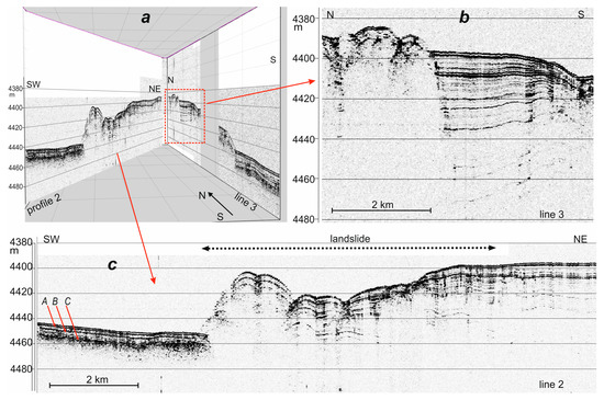 Fragments of seismic profiles 2 and 3 through the landslide bodies in the north of the polygon. (a) common view; (b,c) view in details. The position of the profiles is shown in Figure 1b. Reflectors A, B, and C in (c) mark possibly the ash interlayers.