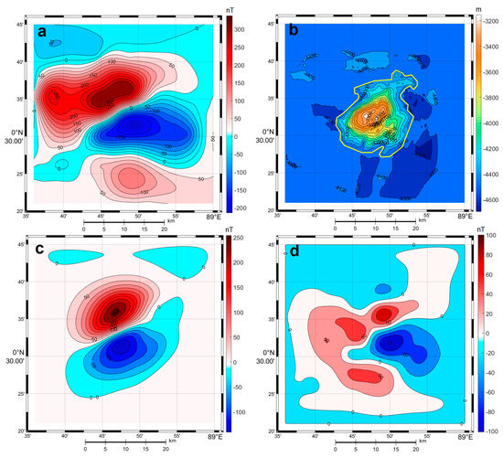 Anomalous magnetic field (AMF) above the seamount and testing of the hypothesis of homogeneous magnetization of this structure: (a) measured field synthesized from geomagnetic surveys, in nT; (b) seamount topography and contour (yellow bold line) limiting the position of the homogeneous source in the horizontal plane, in m; (c) model AMF with a homogeneously magnetized seamount, in nT; and (d) residual field (measured−model), in nT.