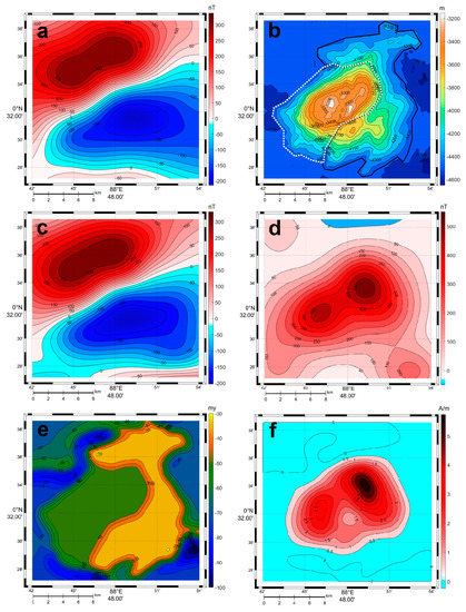 The results of solving the inverse problem, i.e., finding the vector inhomogeneous magnetization in the volume of the mountain, are presented in Figure 8. We obtained an almost complete coincidence between the measured (Figure 8a) and model (Figure 8c) fields (correlation coefficient > 0.99). To verify the model, we also used the solution of the direct problem with the found magnetization values, but under the condition of the verticality of the magnetization vector and the direction of the external field - an analog of reduction to the pole (Figure 8d), which is usually performed only by the AMF maps [45]. The direct correlation of the obtained anomaly with the relief (Figure 8b) is obvious, as well as the confinement of the high magnetization values (Figure 8f) to the main volcanic structures of the seamount—its central two-top block—located inside the white dotted line in Figure 8b. The seamount is characterized by magnetization values up to 5.7 A/m with an average value of 3.2 A/m, which are normal for this type of volcanic structure.