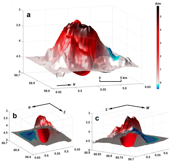 Solution of the inverse problem - finding the inhomogeneous magnetization in the volume of the seamount: (a) magnetization, A/m. The isosurface corresponds to 3 A/m. (b) The isosurface, bottom view from the NE. (c) The isosurface, bottom view from the SW.