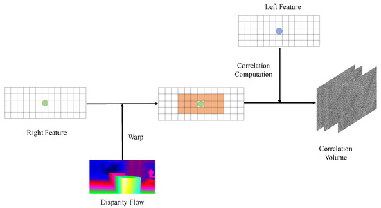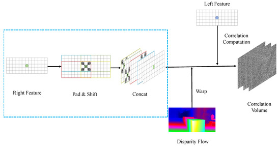 where C is the 4-dimensional correlation cost volume, and are feature maps, is the warping operation, and d and are the current disparity field and shift disparity. It is noteworthy that we added the extra constraint on the vertical direction, so the disparity prediction d will only fall on the horizontal line.