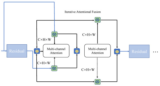 Thus far, we have provided the weight to refine features while they are fusing. However, ref. [35] points out that it is important to consider how to inject features into the attention module, so an iterative approach is proposed. It is composed of two intertwined multi-channel attention modules so that the weights when injecting into the attention module can be updated iteratively. In general, the iterative attentional fusion can be formulated as