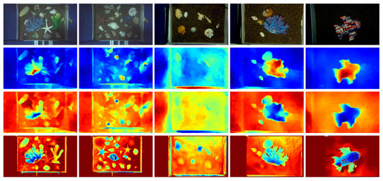 Results of our network on the test set in underwater dataset. The first two image pairs are from the turbid group and the rest are from the low-light group. From top to bottom, they are the original left images, disparity maps generated from our network, depth maps transformed from our predicted disparity maps and depth maps transformed from ground truth disparity.