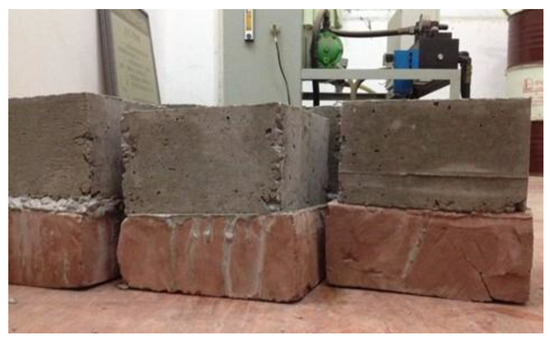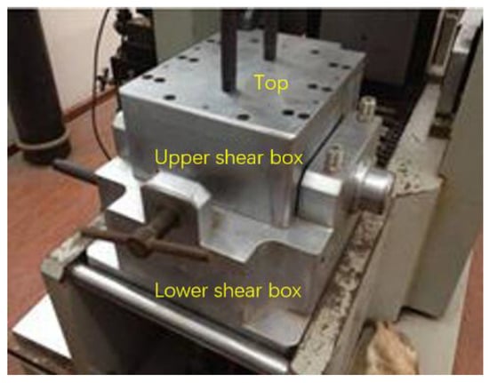 Due to the relevant provisions of the rock test code for Hydraulic and Hydro-Power Engineering (DL/T5368-2007), normal stress can be applied to mudstone–concrete specimens at a certain loading rate after vertical and horizontal preloading is completed [27]. After the normal stress is applied, the horizontal shear force can be applied to the lower shear box. The relative displacement between the upper and lower shear boxes (that is, the shear displacement of the pile–mudstone contact interface) was used as the judging standard. When the displacement exceeded 70 mm, the interface of the pile–mudstone specimen could be judged to have been damaged, and the loading stopped. Figure 4 is the test photo of a specimen after interface failure and disconnection in the natural state.