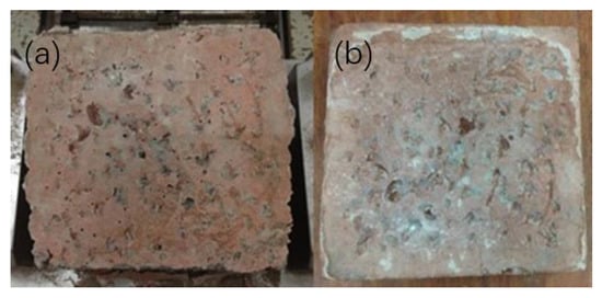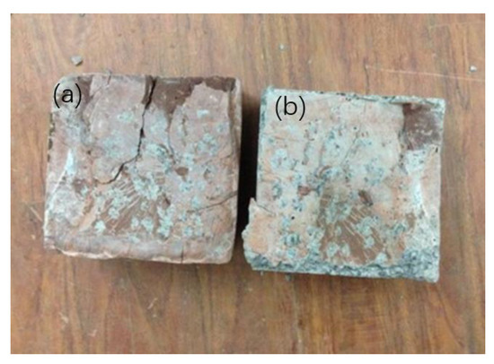 Figure 7. Concrete–mudstone failure interface: (a) interface of damaged concrete; (b) mudstone.