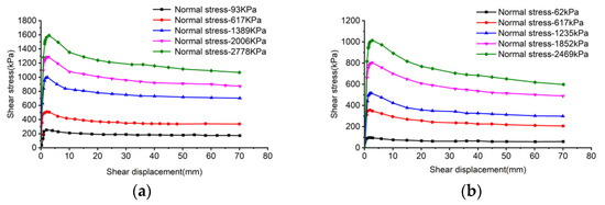 Under the action of all levels of normal pressure, the shear stress shear displacement relationship curve of the natural and saturated mudstone concrete interface test can be obtained, as shown in Figure 5. It can be seen from Figure 5 that in the natural and saturated state, the shear stress first increases rapidly to the peak, then decreases gradually after the peak, and finally remains stable with the increase of shear displacement. In the curve corresponding to the same level of normal stress, there is a very significant peak point of shear stress, and the peak shear stress and residual shear stress in the natural state are greater than those in the saturated state. When the interfacial shear stress exceeds the peak point, its value will gradually decrease and finally tend to be stable.