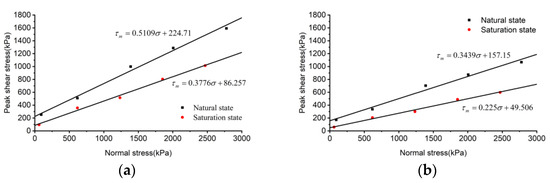 In terms of the interfacial shear stress–shear displacement relation curve, the maximum shear stress of the mudstone–concrete interface in the natural and saturated state can be extracted respectively, and the variation relation between - can be obtained, as shown in Figure 6.