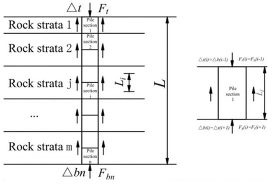 where is positive from the bottom upwards, and are the vertical loads and vertical displacement of the pile foundation at , is the elastic modulus of the concrete pile foundation, and and are the area and perimeter of the pile section, respectively. According to Equation (12) above, it can be concluded that the pile body of a rock-socketed pile is regarded as an elastomer, and it is assumed that the displacement and of the pile top and bottom meet Equation (14):