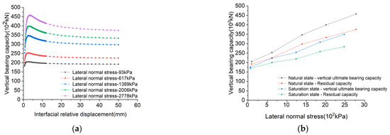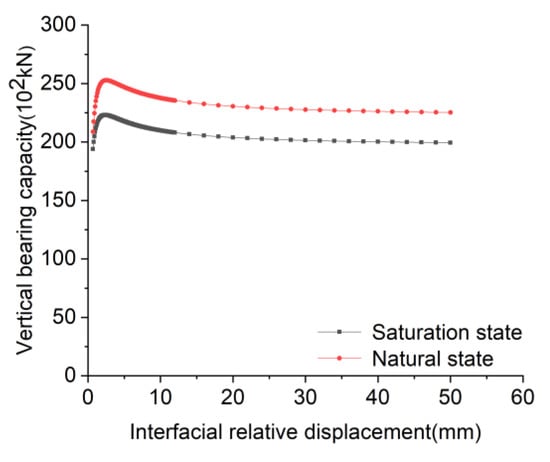Taking a group of typical parameters as an example, the variation rule of vertical bearing capacity was analyzed, as shown in Figure 10. The vertical bearing capacity of rock-socketed pile in the natural mudstone condition increased rapidly with the increase of interface relative displacement. When the interface error momentum was 2.5 mm, the vertical bearing capacity reached the ultimate bearing value of 2.53 × 104 kN. While the interface displacement continued to increase, the vertical bearing capacity gradually decreased and finally reached a stable value, showing a changing mechanism of “first increasing, then decreasing, and finally leveling”. In the natural state, the lateral friction resistance and tip resistance of rock-socketed pile accounted for 38% and 62% of the vertical ultimate bearing capacity, respectively, while the residual bearing capacity was 88.35% of the peak ultimate bearing capacity. The vertical ultimate bearing capacity and residual bearing capacity in the saturated state were 89.49% and 89.73% of those in the natural state, respectively.